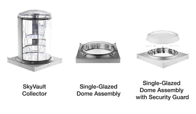 It all starts with standard domes that are available in both single- and dual-glazed configurations with optional security guards. But then the light capture gets really big with the oversized SkyVault Collector that redirects low-angle light downward while filtering out the heat of infrared rays.